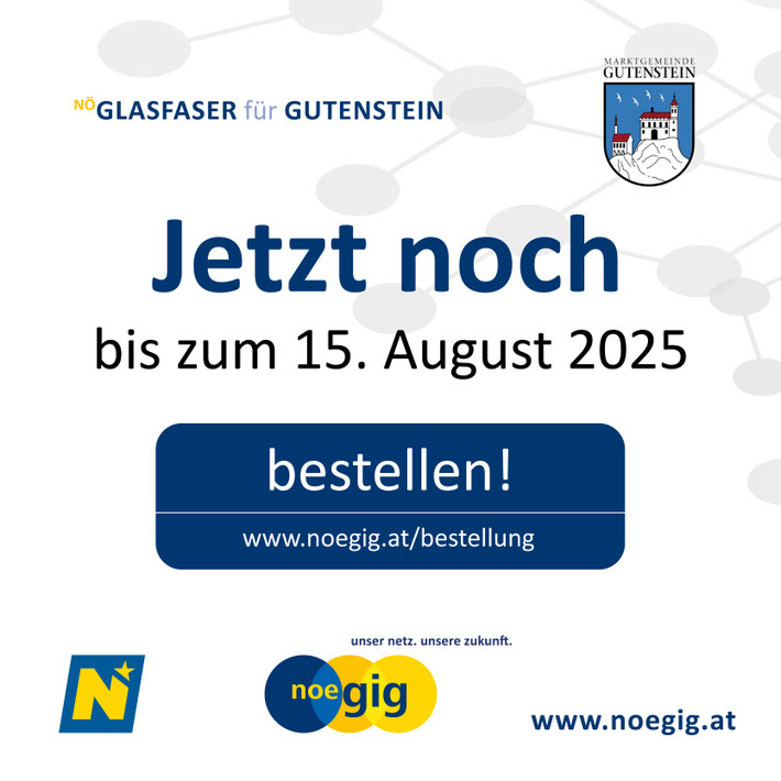 Wasser, Kanalisation oder Strom sind längst zur Selbstverständlichkeit geworden. Heute ist die Versorgung mit leistungsfähigen Breitbandanschlüssen die große Herausforderung – vor allem im ländlichen Raum. Rund 600 Haushalte und Betriebe in Gutenstien haben nun die Chance auf Glasfaseranschlüsse bis ins Haus. Wenn bis 15. Juli 2025 mehr als 42 Prozent der Haushalte und Betriebe im vorgesehenen Ausbaugebiet eine Bestellung für einen NÖ Glasfaseranschluss zu den Aktionskonditionen von Eur 300,- abgeben, könnten die Bauarbeiten voraussichtlich ab Frühjahr 2026 starten.